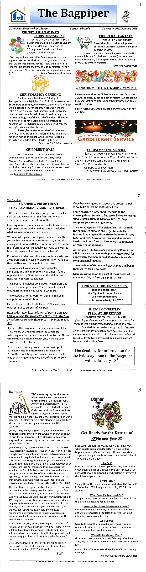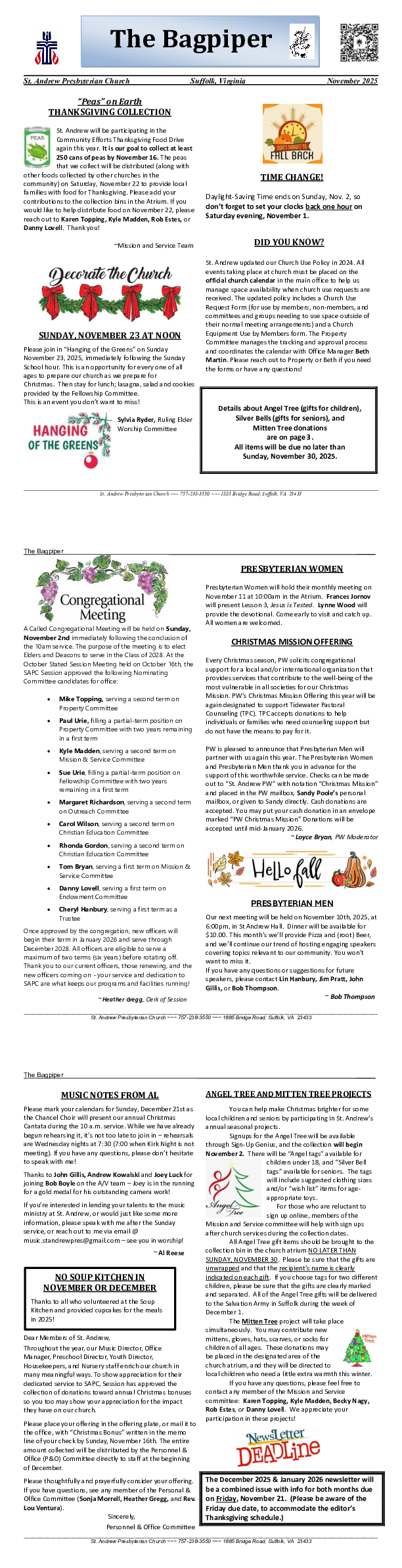 St. Andrew publishes a monthly newsletter called The Bagpiper. Have a look for information about upcoming events and our history, a note from our pastor, and a calendar of everything going on.